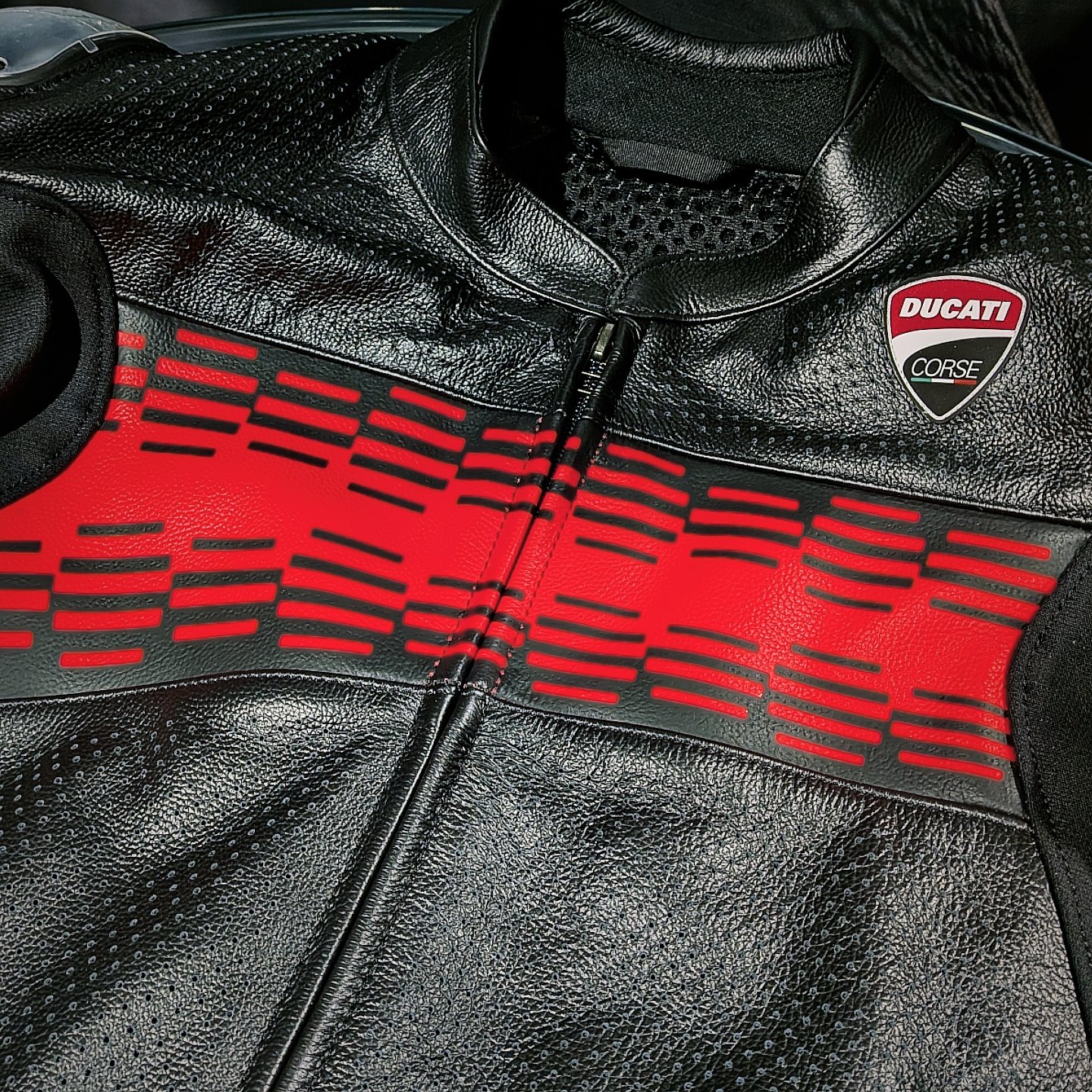 肩から袖にかけて入ったDucati Corseのロゴ、胸元にはシールドロゴと模様が鮮やかな赤であしらわれております👏