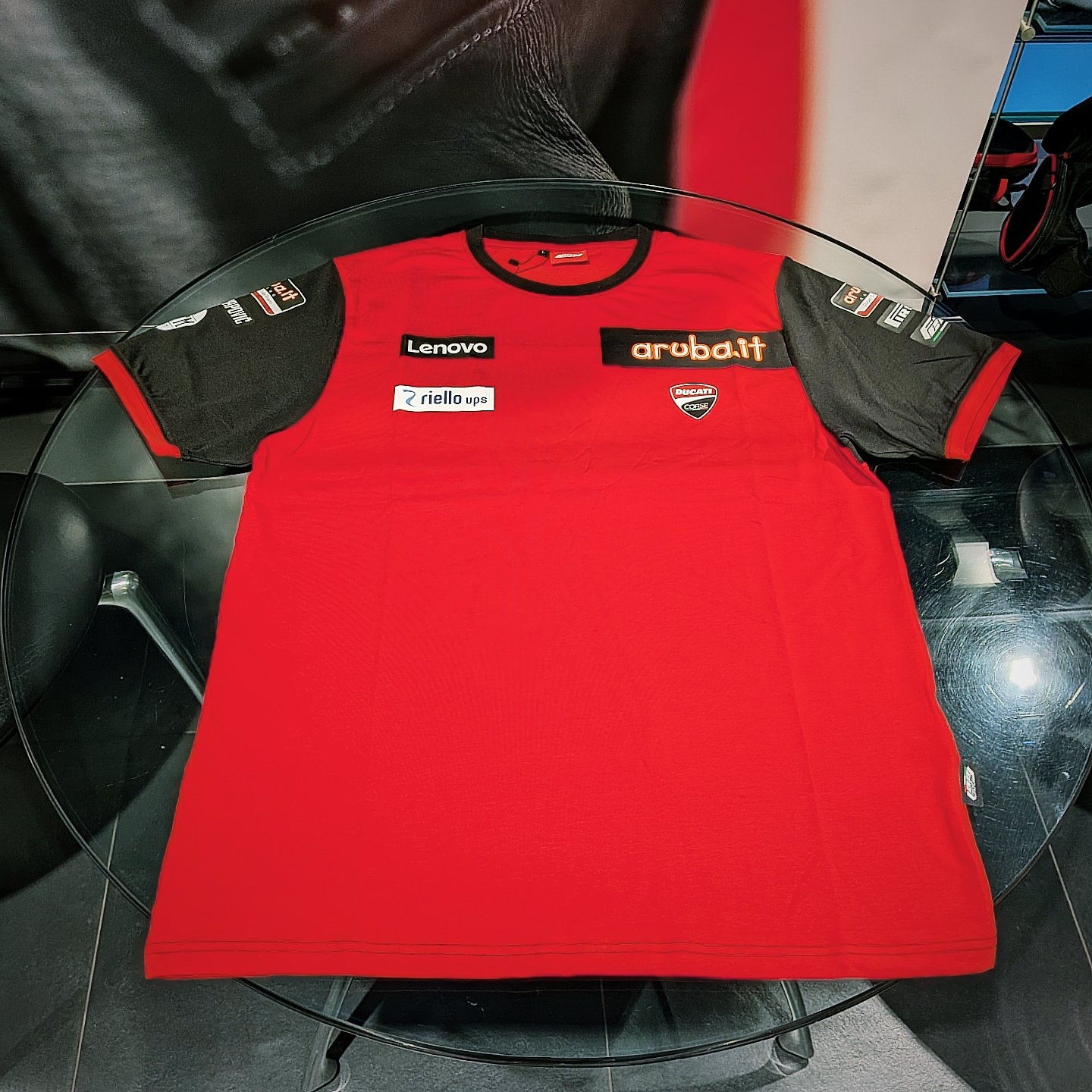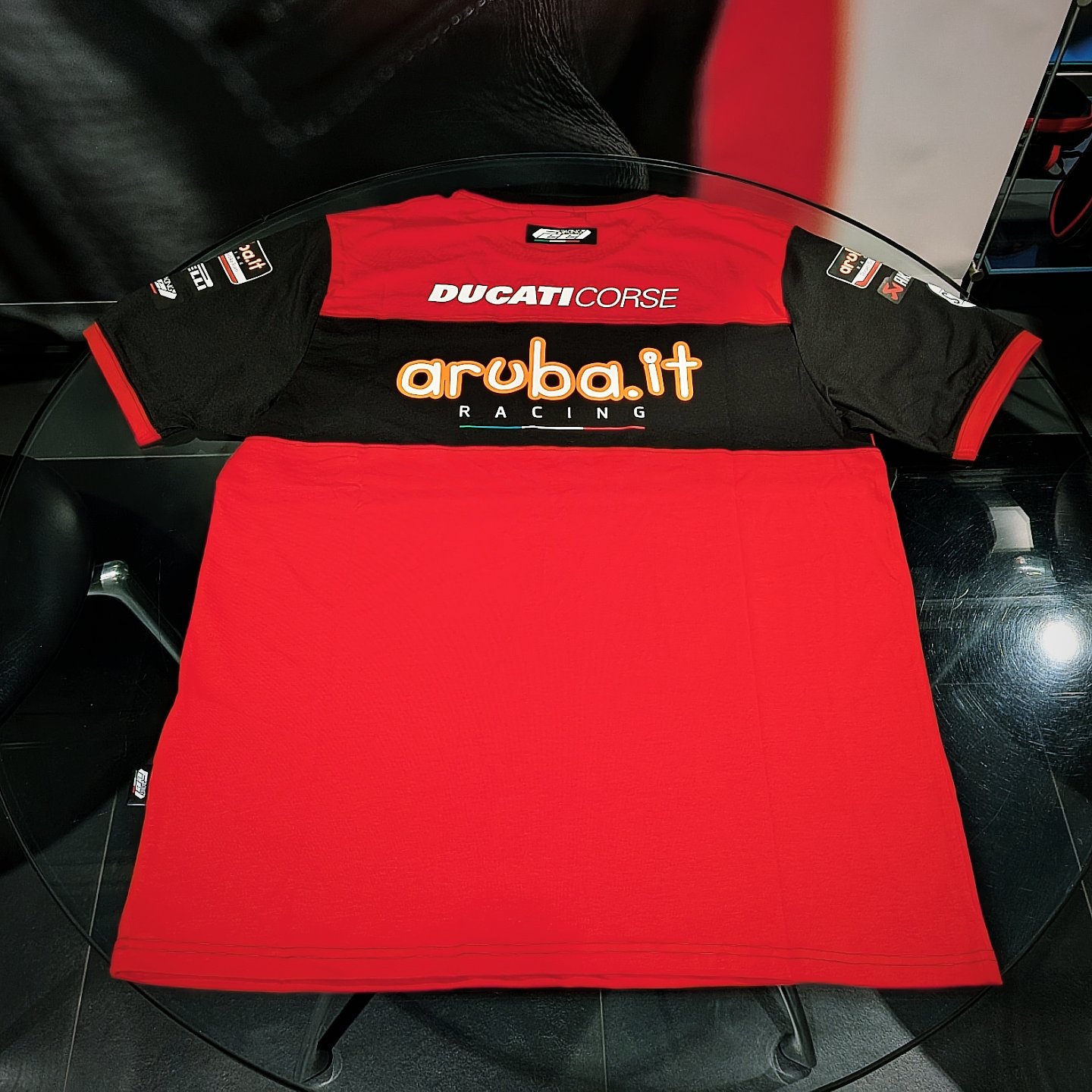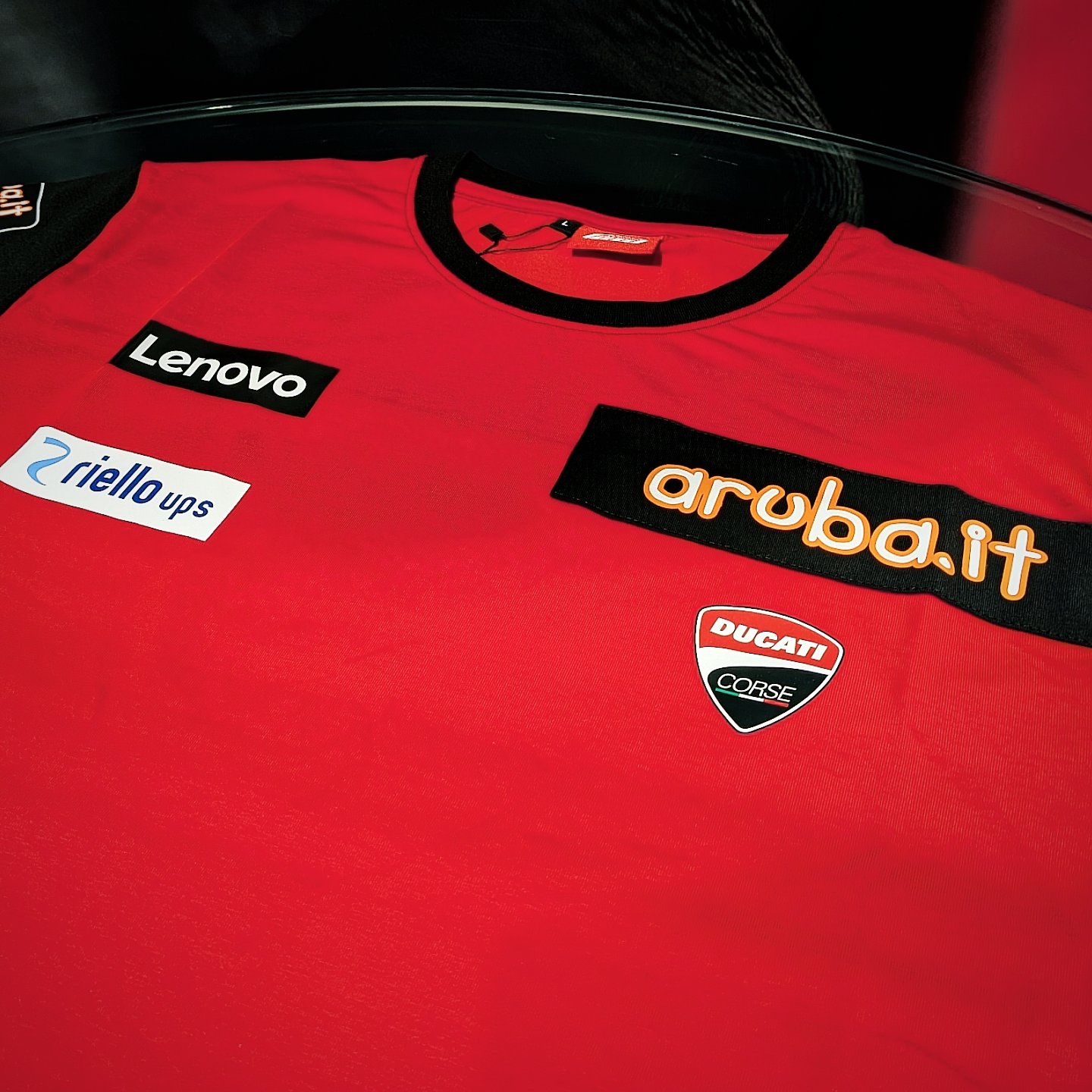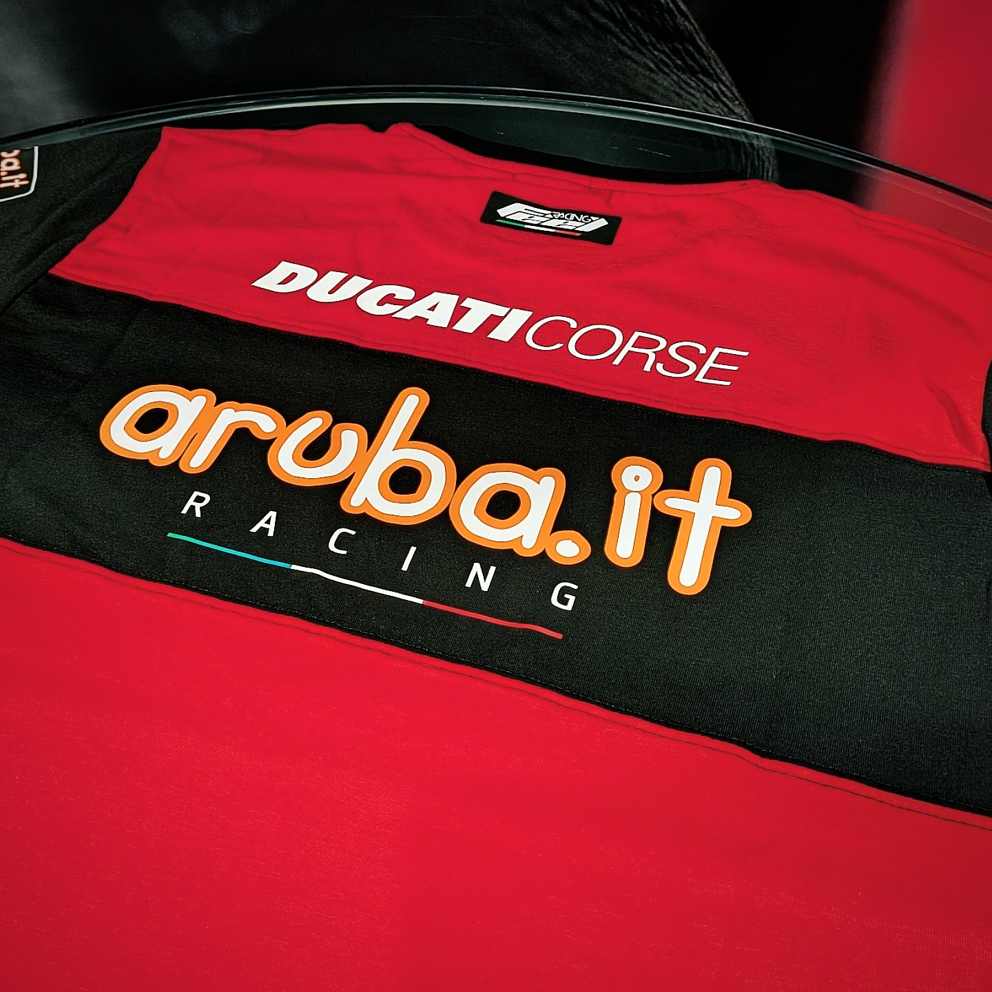 スポンサーロゴが前面と袖に入っており、背面に入ったDucati Corseのロゴとaruba.itのロゴが特徴的です👀