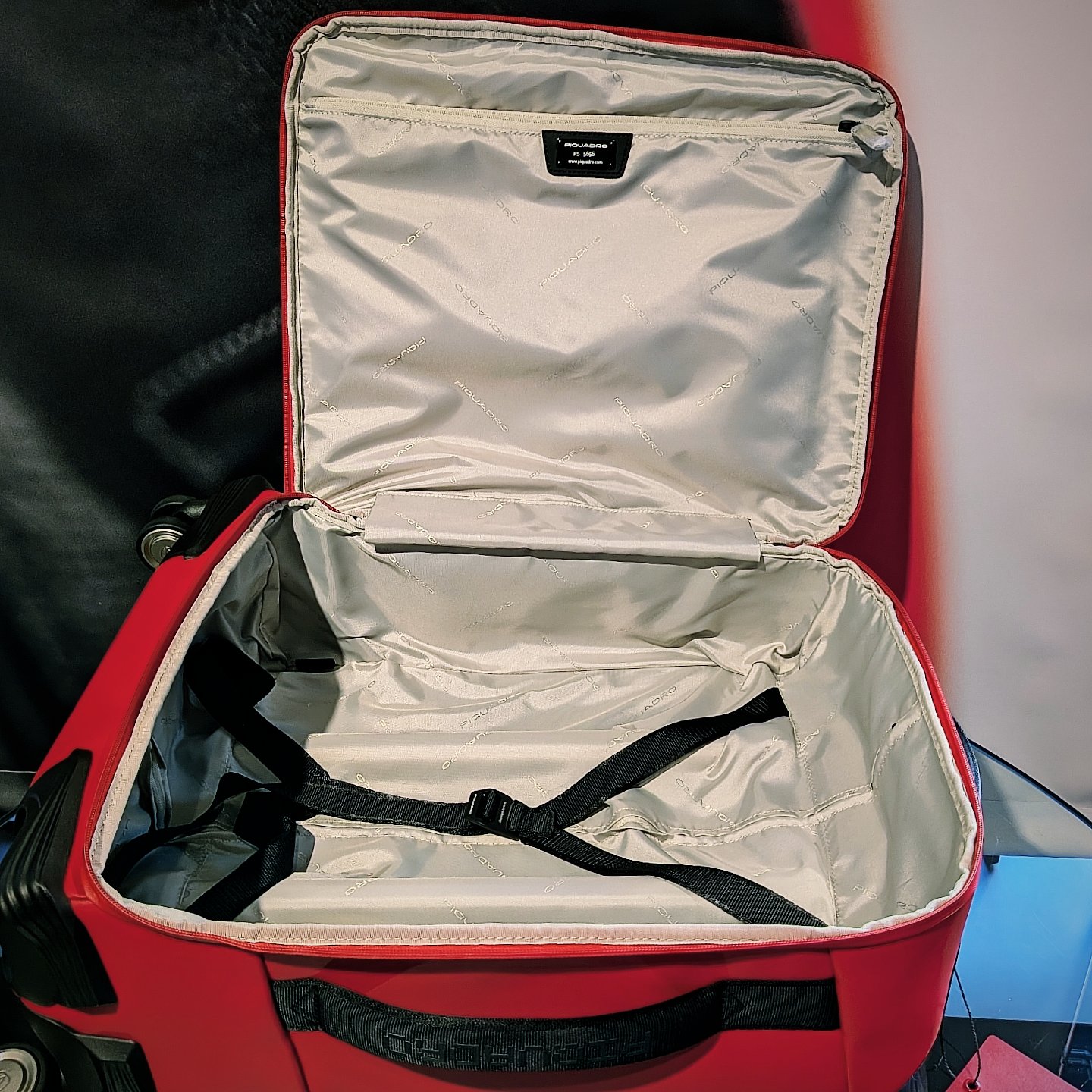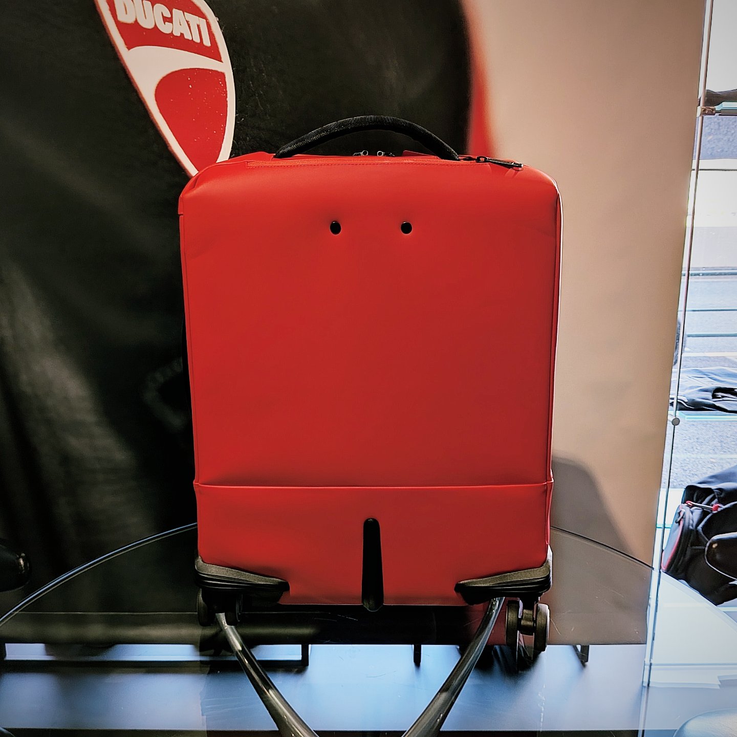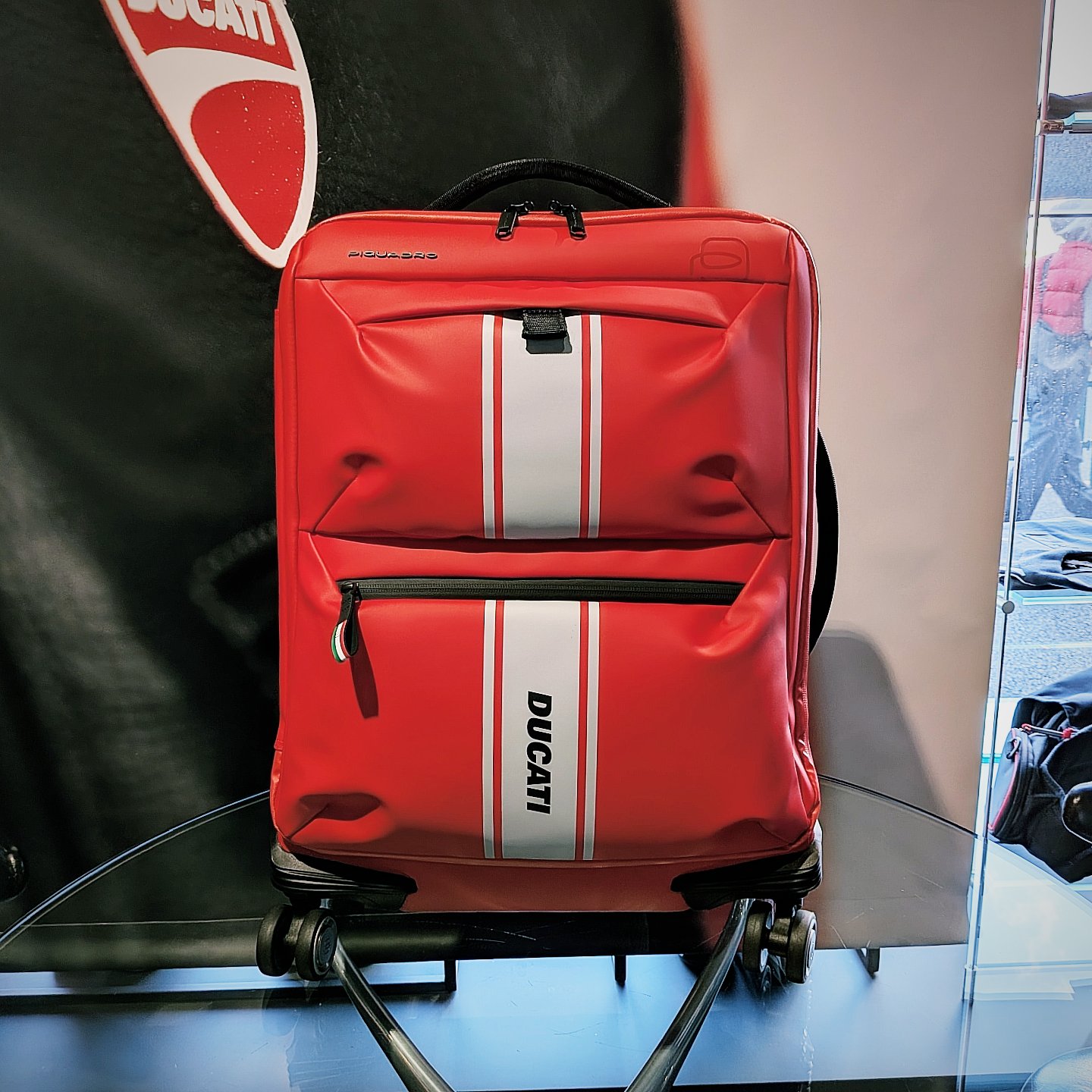 取っ手部にはDucatiのロゴやキャスター部にはPiquadroのロゴなど細部にまでこだわった遊び心のあるアイテムとなっております😳